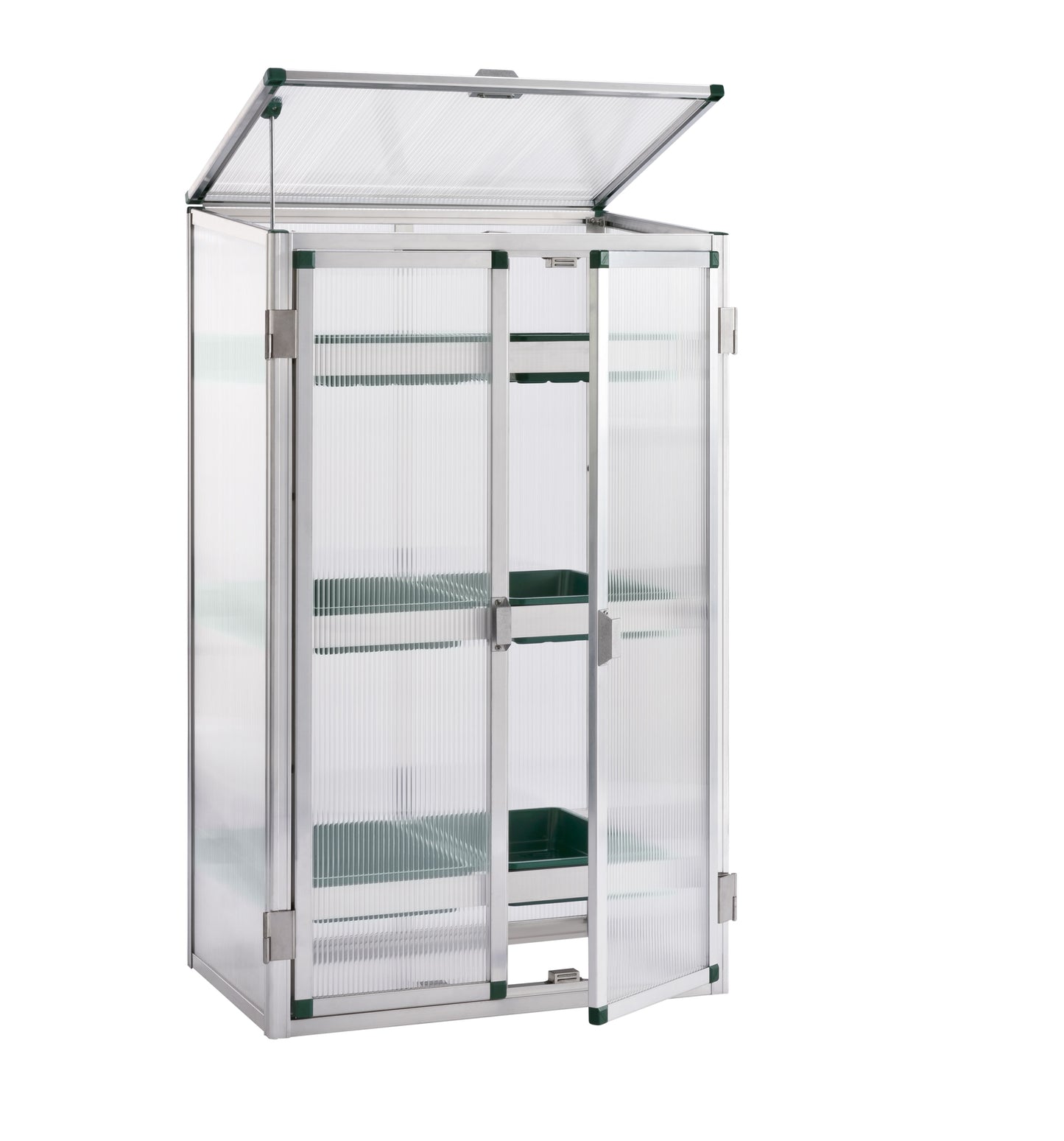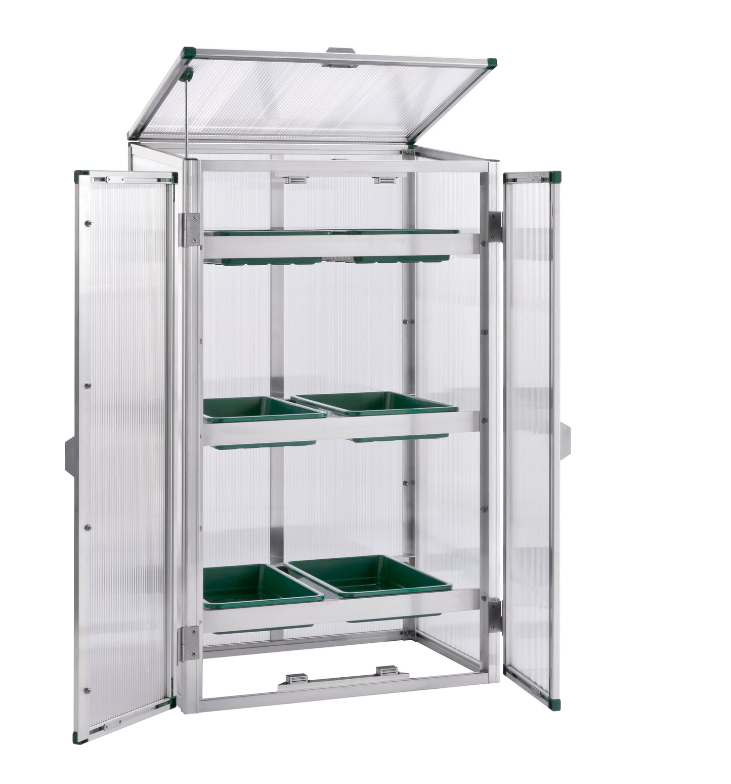 Die Ebenen mit den Saatschalen können in verschiedenen Höhen fixiert werden. Der Einlegeboden aus transparenter Stegdoppelplatte ermöglicht die variable Anordnung von kleinen Töpfen.