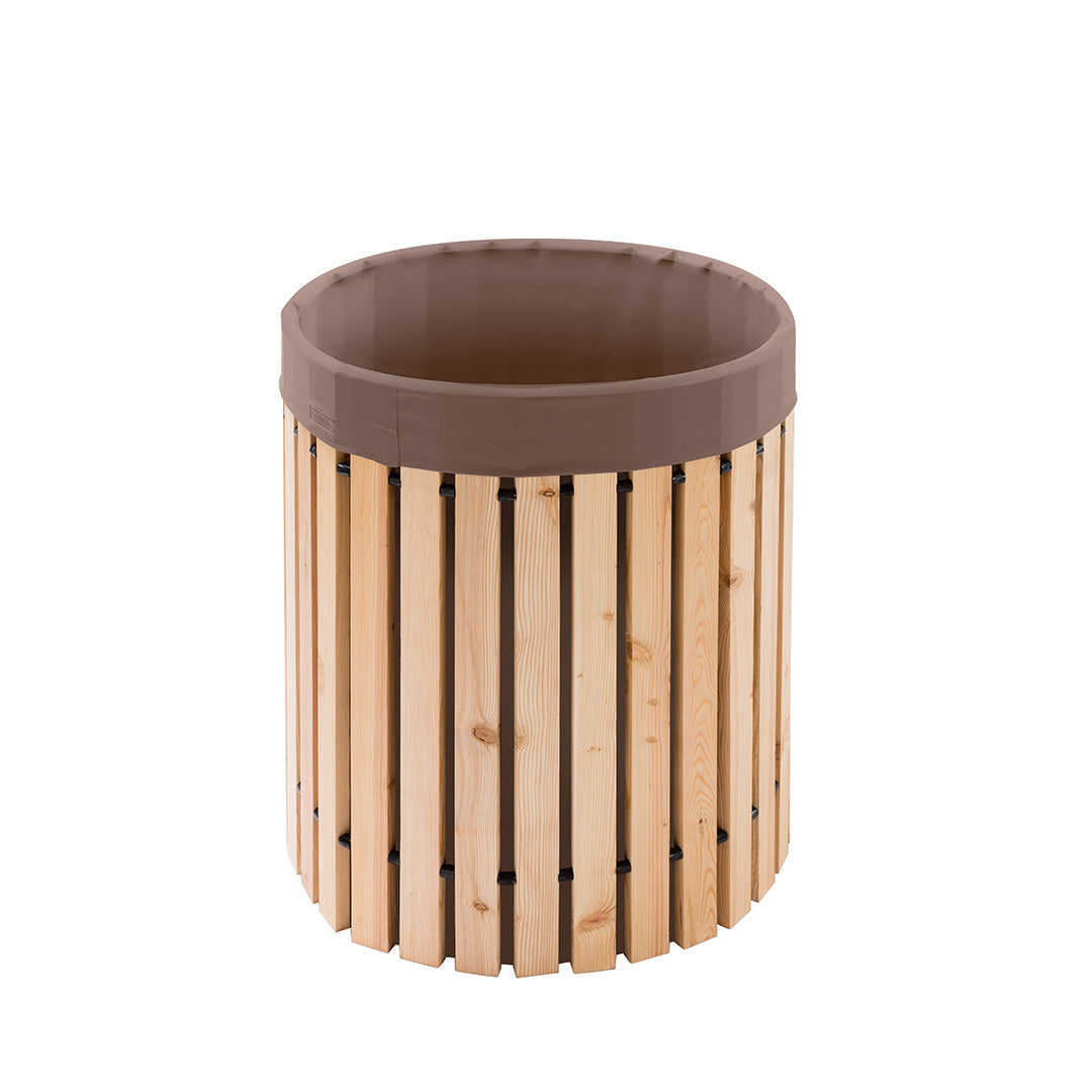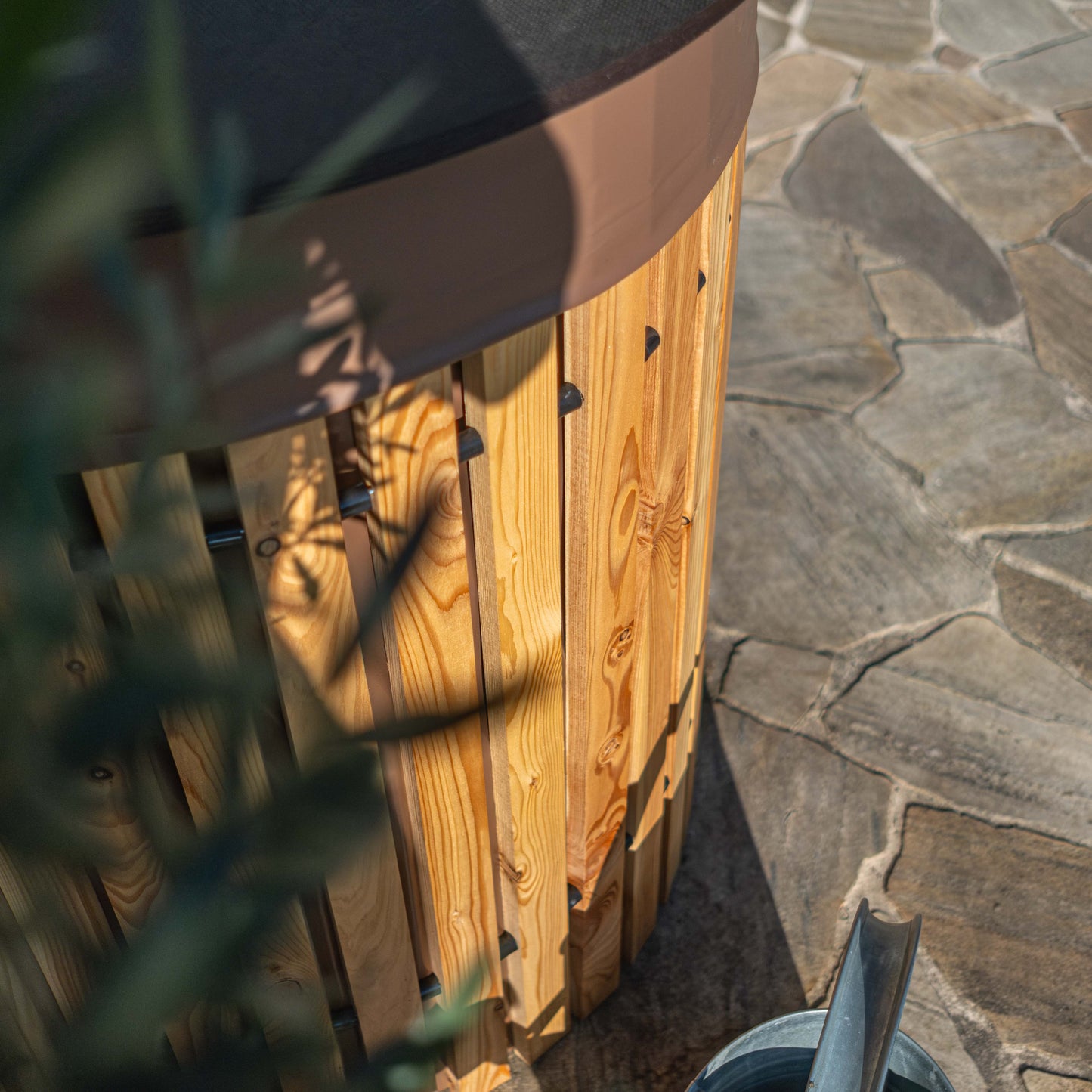 Gefertigt aus gehobelten Lärchenholzleisten wird jedes Fass durch innenliegende Drahtseile stabil zusammengehalten. Das langsam gewachsene Lärchenholz ist von Natur aus witterungsbeständig – ganz ohne chemische Holzschutzmittel.