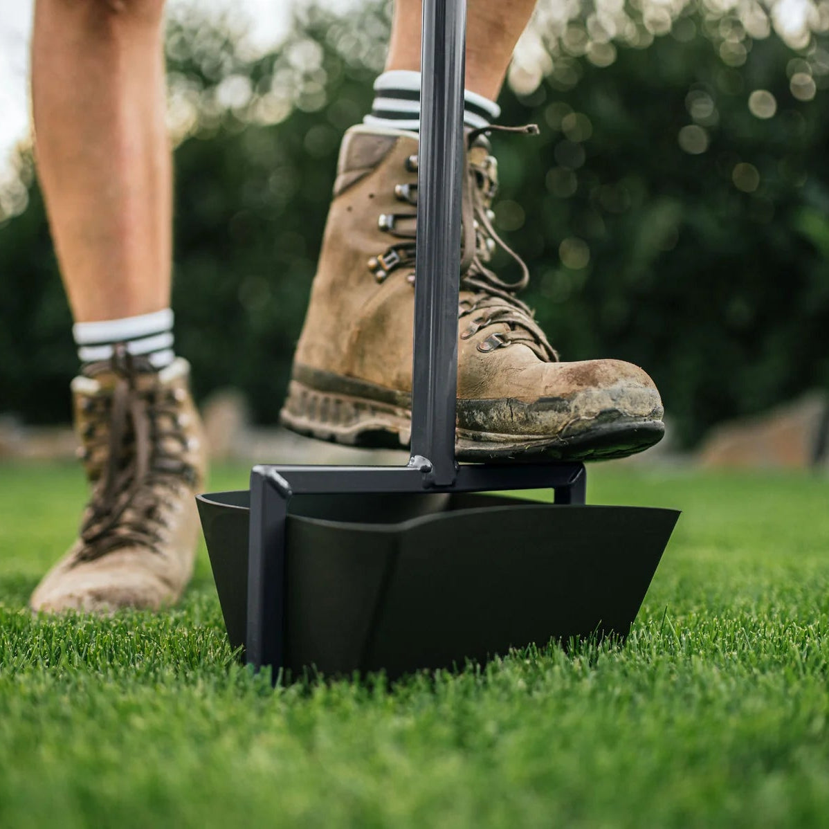 Die Anwendung ist einfacher, als viele denken: Mit etwas Druck wird der Aerifizierer in den Boden gestochen, die Erde wird durch die montierte Wanne aufgefangen.